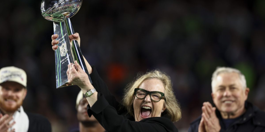 Following a decisive 29-13 win Sunday night over the New England Patriots, the billionaire owner of the Seattle Seahawks, Jody Allen, took to the stage at Levi’s Stadium to triumphantly hoist the Lombardi trophy in the air.